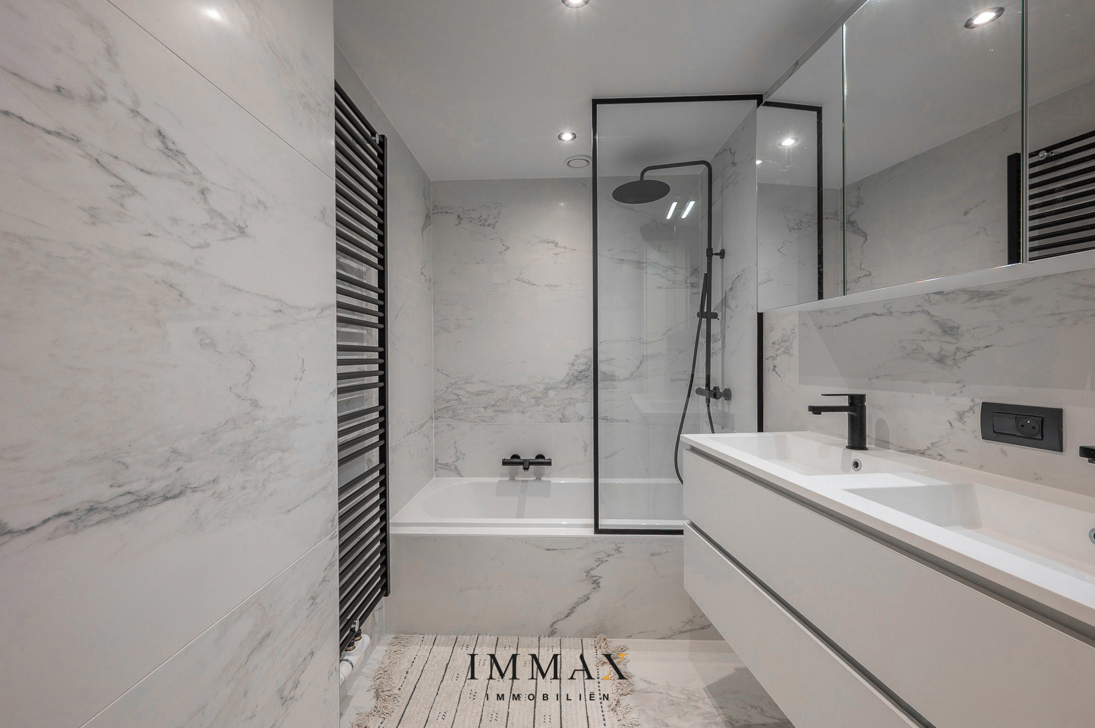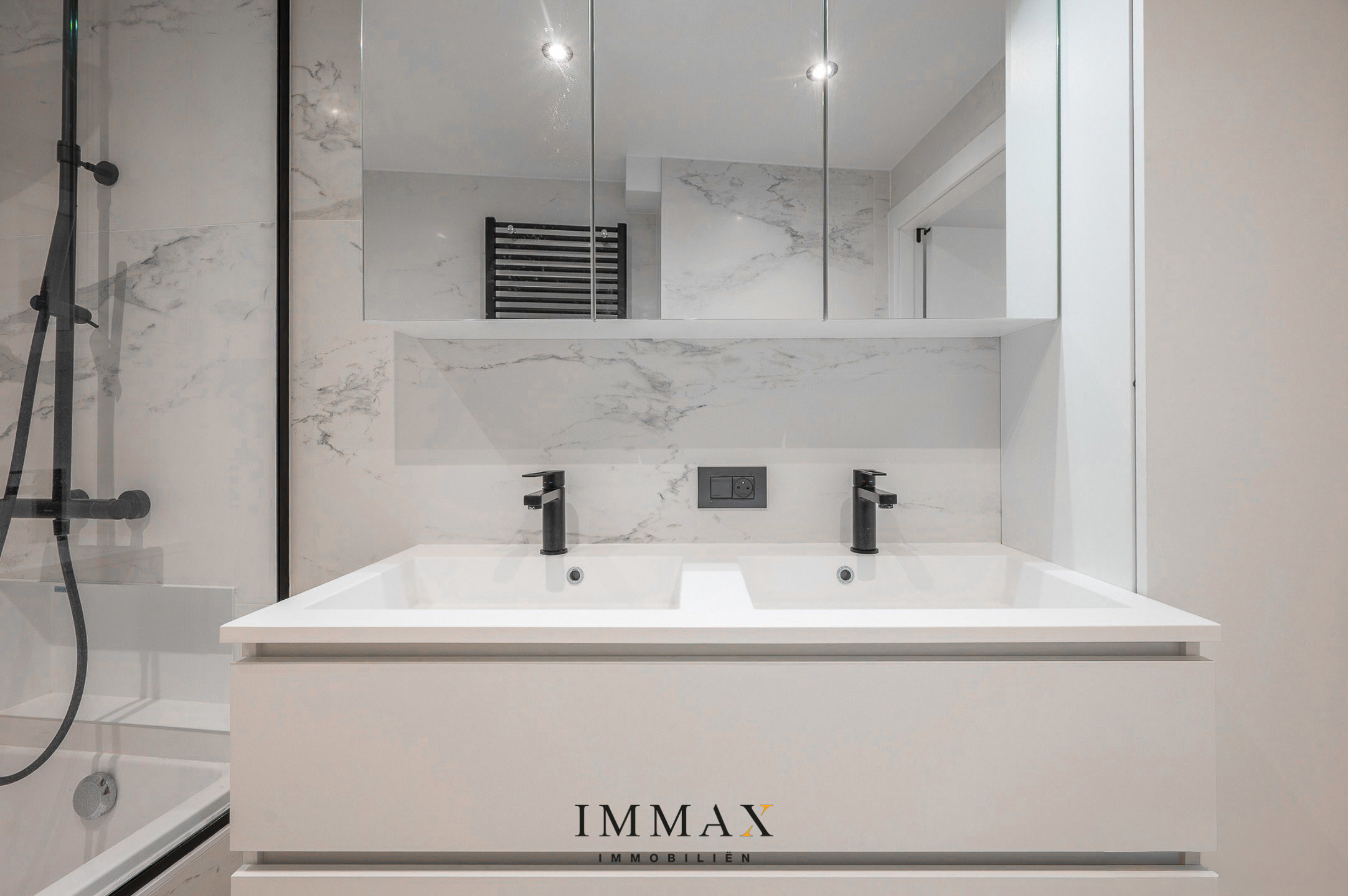 Il comprend un hall d'entrée spacieux avec toilettes pour invités, qui donne sur un espace de vie lumineux et accueillant avec une cuisine ouverte entièrement équipée. À côté se trouve un débarras discret avec branchements pour lave-linge, ce qui offre un confort et une fonctionnalité supplémentaires. L'appartement dispose de deux chambres spacieuses avec des armoires sur mesure et d'une salle de bains luxueuse équipée d'une baignoire et d'un double lavabo. La troisième chambre dispose d'une élégante salle de bains attenante avec douche. À l'arrière de l'appartement se trouve une agréable terrasse.