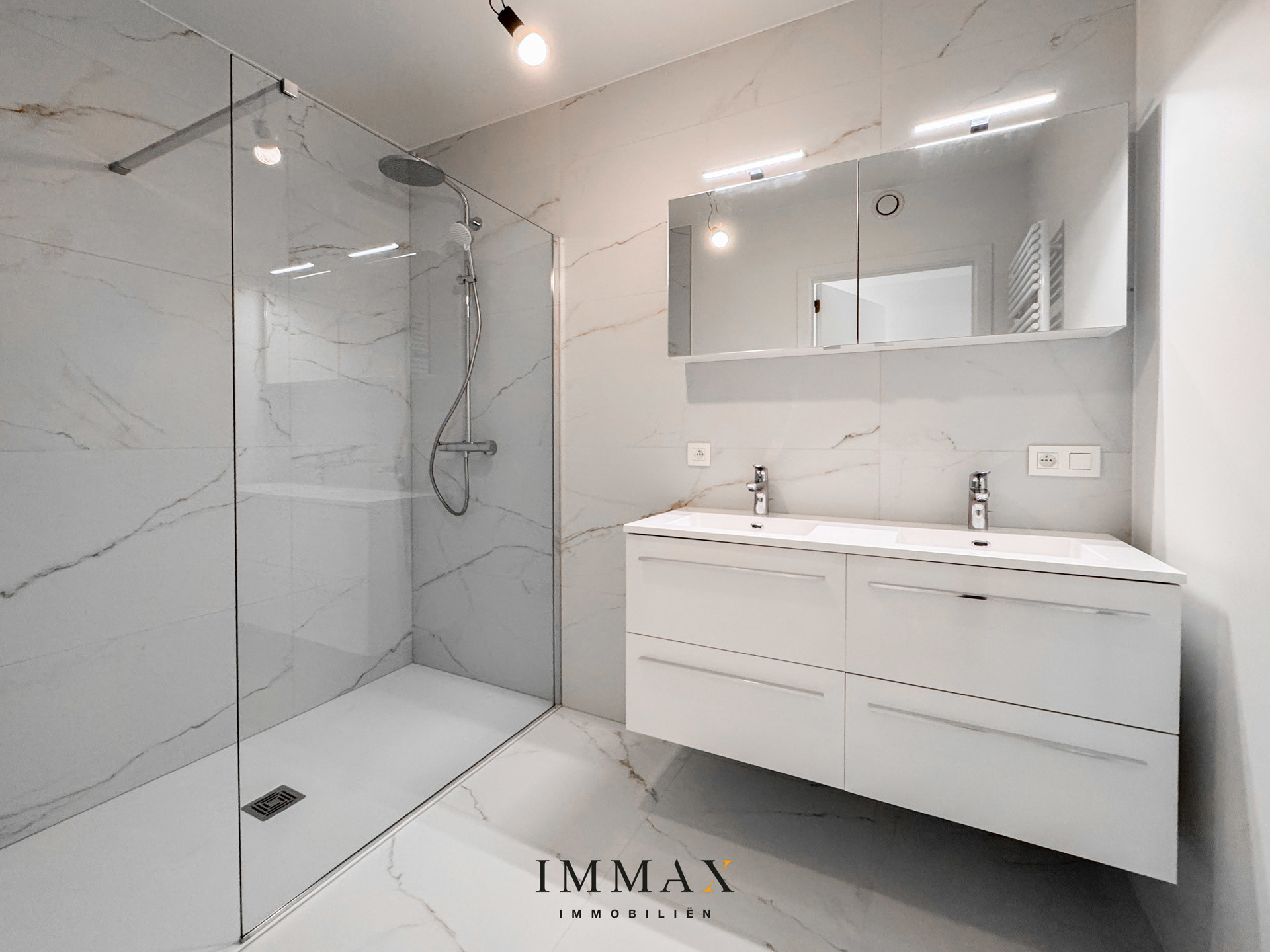 Hall d'entrée avec toilettes invités, séjour avec cuisine ouverte et coin repas avec terrasse attenante (4 m²), salle de bains équipée de toilettes - double lavabo - baignoire et douche, 2 chambres avec accès à la 2ème terrasse (10 m²).