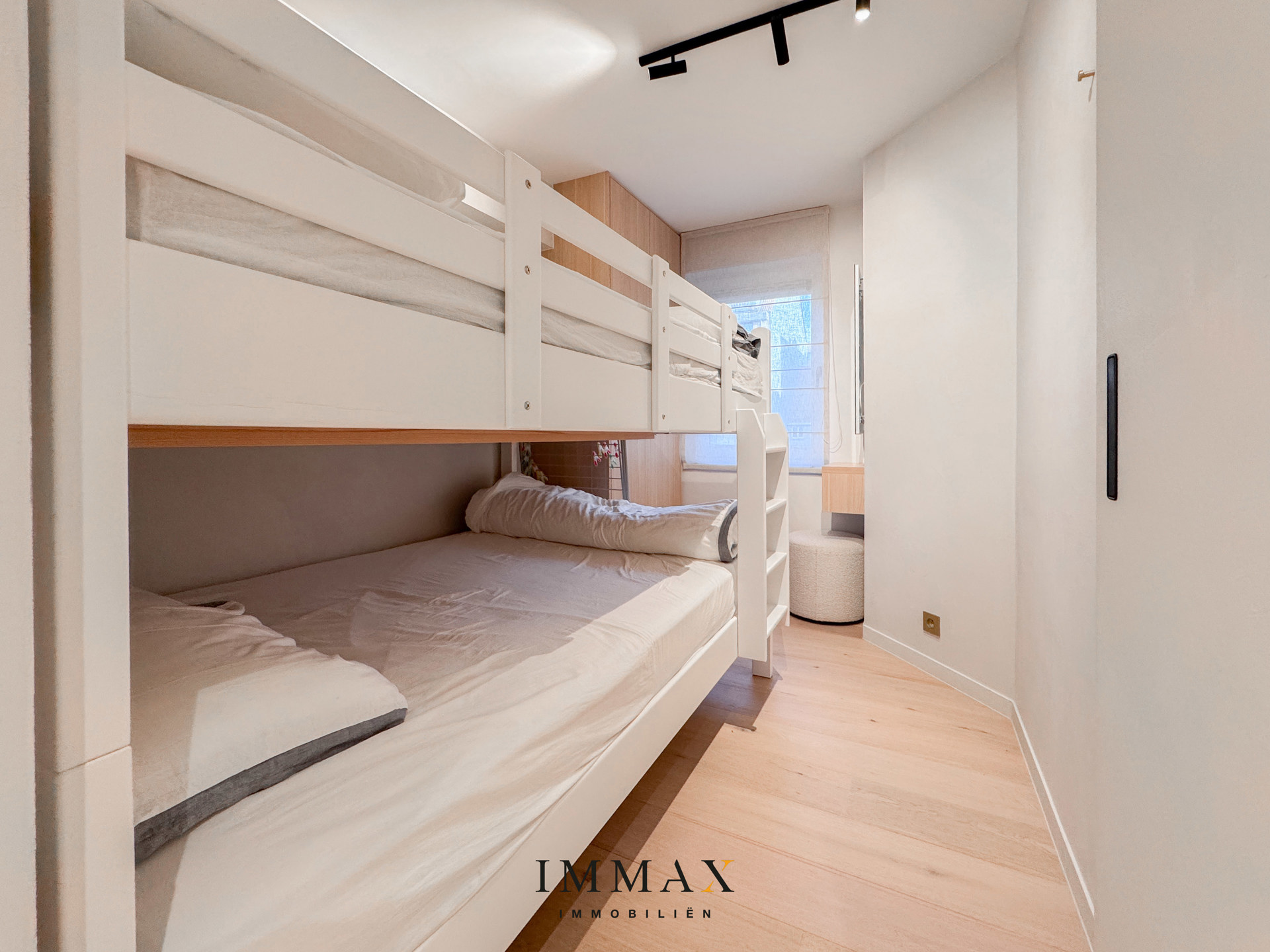 Dit elegant gerenoveerde appartement met twee slaapkamers is gelegen op de Leopoldlaan in Knokke, in een rustig en verzorgd gebouw op wandelafstand van de zee en in de onmiddellijke nabijheid van de Lippenslaan. De inkomhal biedt toegang tot een lichtrijke leefruimte met een open en harmonieuze indeling, aansluitend op een moderne keuken die volledig is uitgerust met kwalitatieve Siemens- en Bora-toestellen. Beide slaapkamers zijn voorzien van ingemaakte kasten. De master bedroom biedt ruimte voor een tweepersoonsbed, terwijl de tweede slaapkamer geschikt is voor een bed van 140 x 200 cm of een stapelbed. De stijlvolle badkamer is afgewerkt met hoogwaardige materialen en beschikt over een inloop regendouche en een lavabo. Daarnaast is er een apart toilet aanwezig. De recente renovatie werd uitgevoerd met oog voor detail en comfort, met onder meer mortex-afwerking, hoogrendementsglas en energiezuinige infraroodverwarming met individuele regeling via app.
