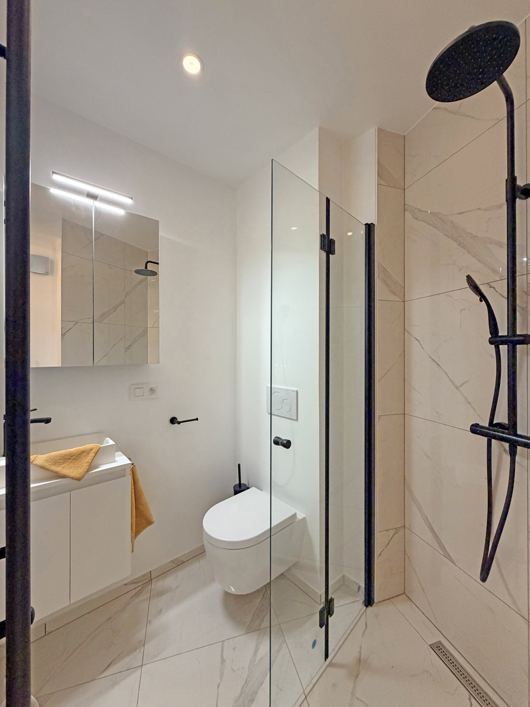 Het appartement beschikt over een inkomhal met gastentoilet, een lichtrijke leefruimte met open, volledig uitgeruste keuken en twee slaapkamers, elk met een eigen doucheruimte. De master bedroom geeft bovendien uit op het terras. Een privatieve kelderberging is inbegrepen.